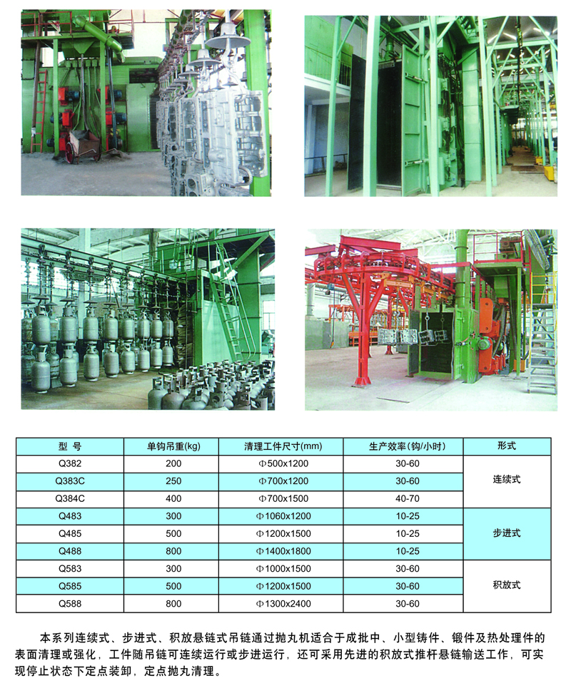 •       本系列連續式、步進式、積放懸鏈式吊鏈通過拋丸機適用于成比中、小型鑄件、鍛件及熱處理件的表面清理或強化,工件隨吊鏈可連續運行或步進運行,還可采用先進的積放推桿懸鏈輸送工作,可實現停止狀態下定點裝卸,定點拋丸清理。