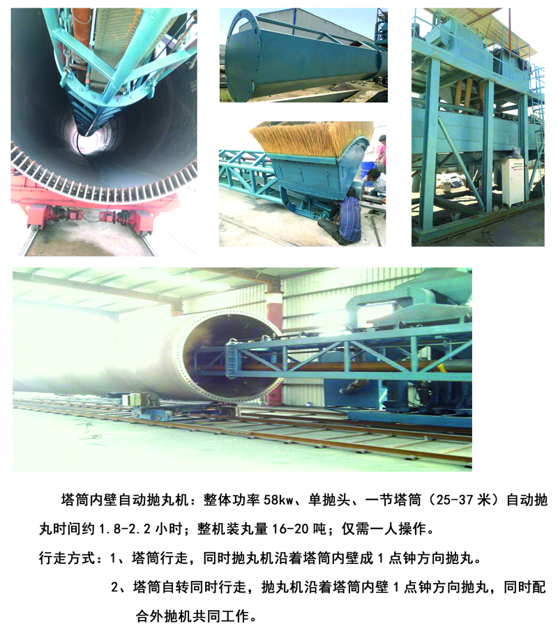 整體功率58KW、單拋頭、一節塔筒(25-37米)自動拋丸時間約1.8-2.2小時,整機裝丸量16-20噸;僅需一人操作。